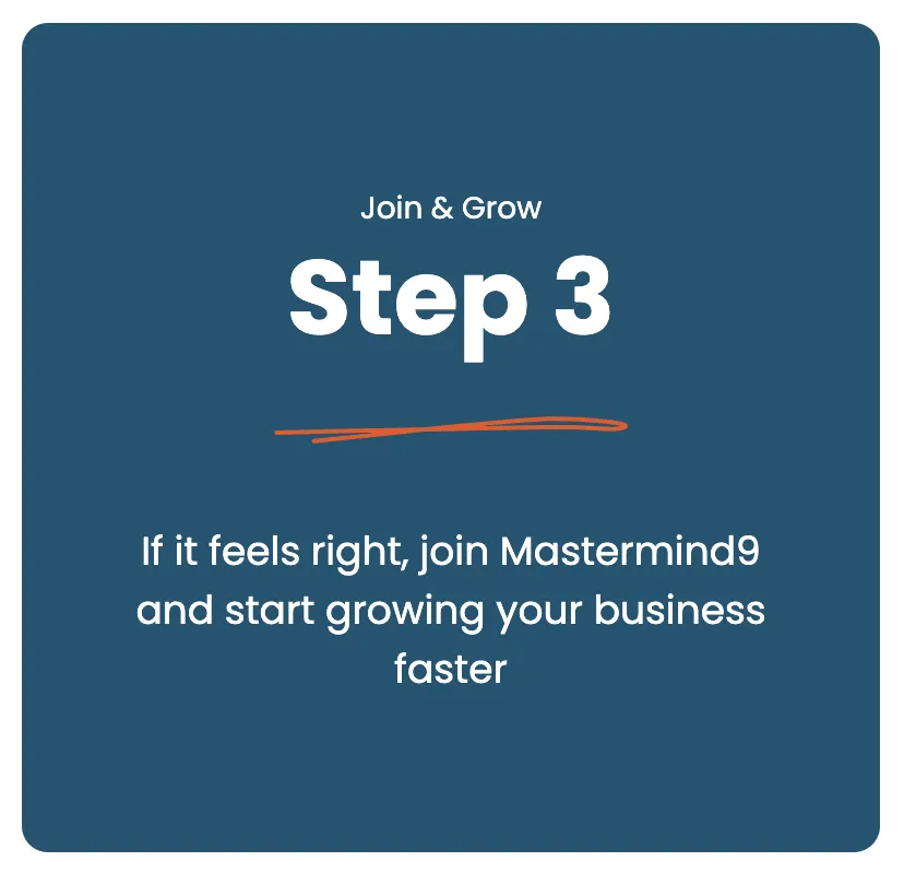 This isn’t a sales pitch. It’s a quick chat to understand your business, your challenges, your goals, your blockers, and whether Mastermind9 is the right fit for you.